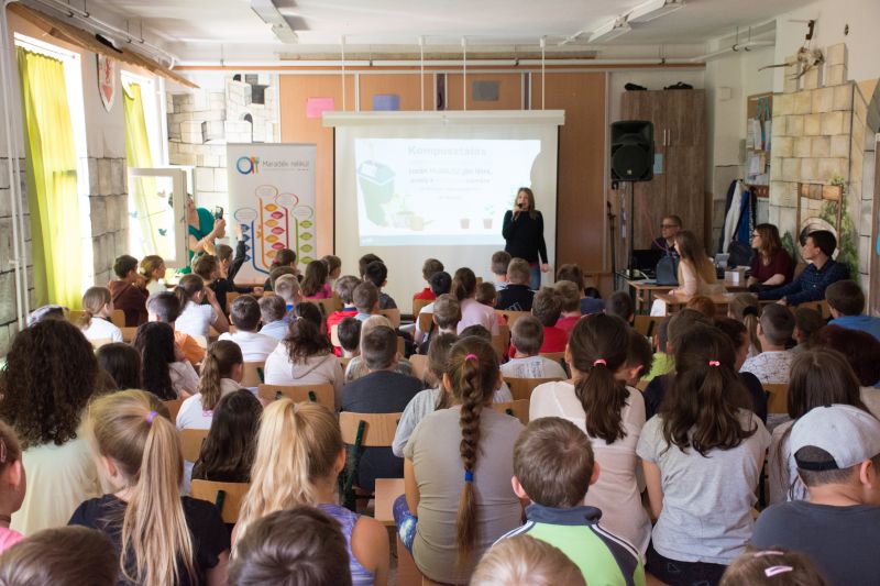 Megtudhattuk, hogy otthon sokan a komposztálást, illetve az állatetetést, mint az élelmiszerhulladék csökkentésének módszerét, nap mint nap alkalmazzák. Többen számoltak be arról, hogy előfordult már, hogy egy romlott joghurt, vagy egy penészes kenyér a kukában végezte náluk. A tanulás mellett természetesen a kvíz és a csapatjáték sem maradhatott el, amelynek során meglepődve tapasztaltuk, hogy a gyerekek milyen könnyen sajátították el az előadás első felében hallott ismereteket. Ezt mi sem bizonyítja jobban, hogy a toll- és a lufikészletünk meglehetősen leapadt, ugyanis a feltett kvíz kérdésekre helyesen válaszolók ezekben az ajándékokban részesülhettek.