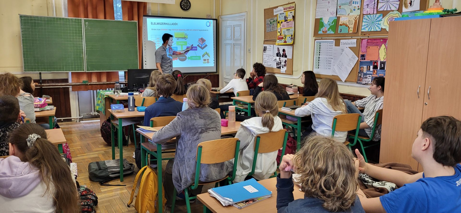 A Fenntarthatósági Témahét alkalmat teremtett, hogy ismét ellátogassunk a budapesti VI. Kerületi Derkovits Gyula Általános Iskolába. A mostani látogatás alkalmával a 6. osztályosok hallgathatták meg az élelmiszerhulladékokkal és élelmiszerpazarlással foglalkozó előadásunkat.