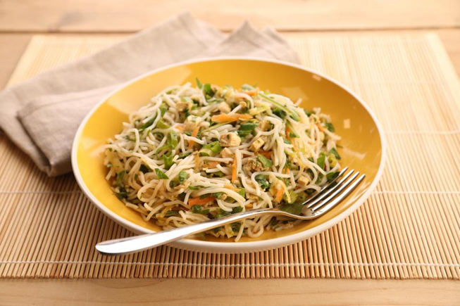 A zöldségeket vágjuk fel vékony szeletekre, a rizstésztát a csomagoláson előírtaknak megfelelően készítsük el. Egy serpenyőben kevés zsiradékon pirítsuk meg a húst és a zöldségeket. Egy tálba tegyük bele a szezámmagolajat, a megsült zöldséges-húsos keveréket, chilit, majd keverjük alaposan össze. Ízesítsük kedvünk szerint. Végezetül pedig adjuk hozzá a lecsepegtetett tésztát, keverjük össze és már fogyasztható is.