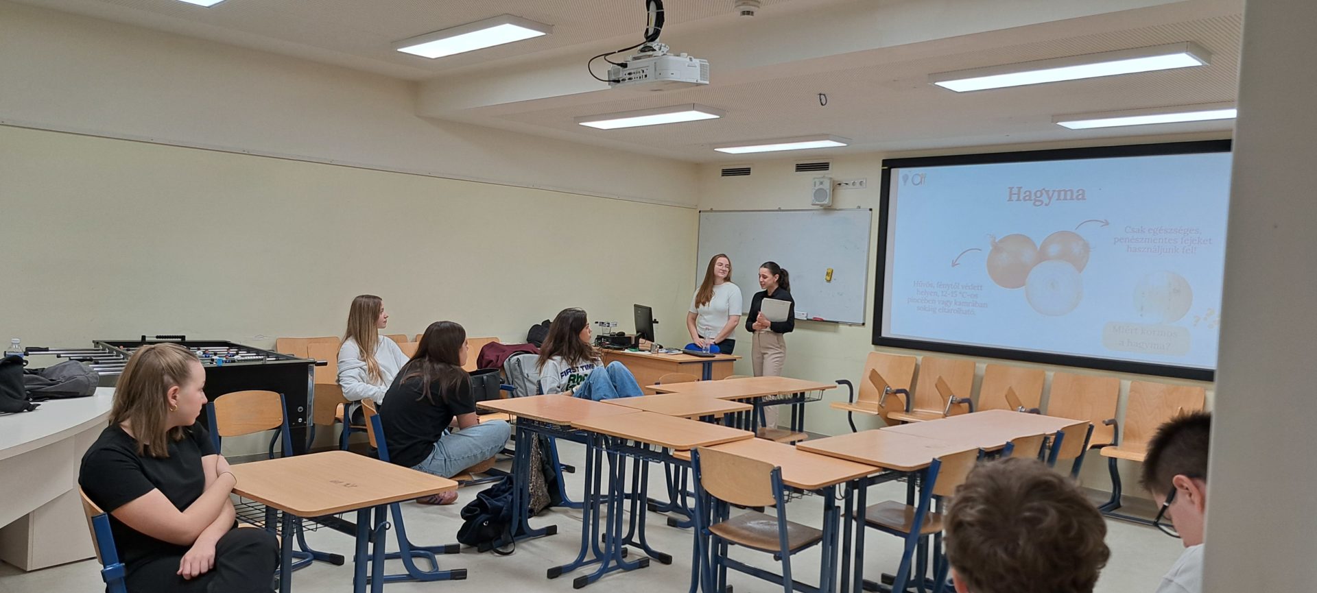 Az előadás során további praktikus tippek hangzottak el, például a komposztálás fontossága, a szezonális alapanyagok használata, és a használt sütőolaj megfelelő kezelése is helyet kapott. Kiemelt figyelmet fordítottunk arra, hogy a „főzés” közben a diákok az alapanyagokon keresztül az élelmiszerbiztonsági kockázatokat is megismerjék.