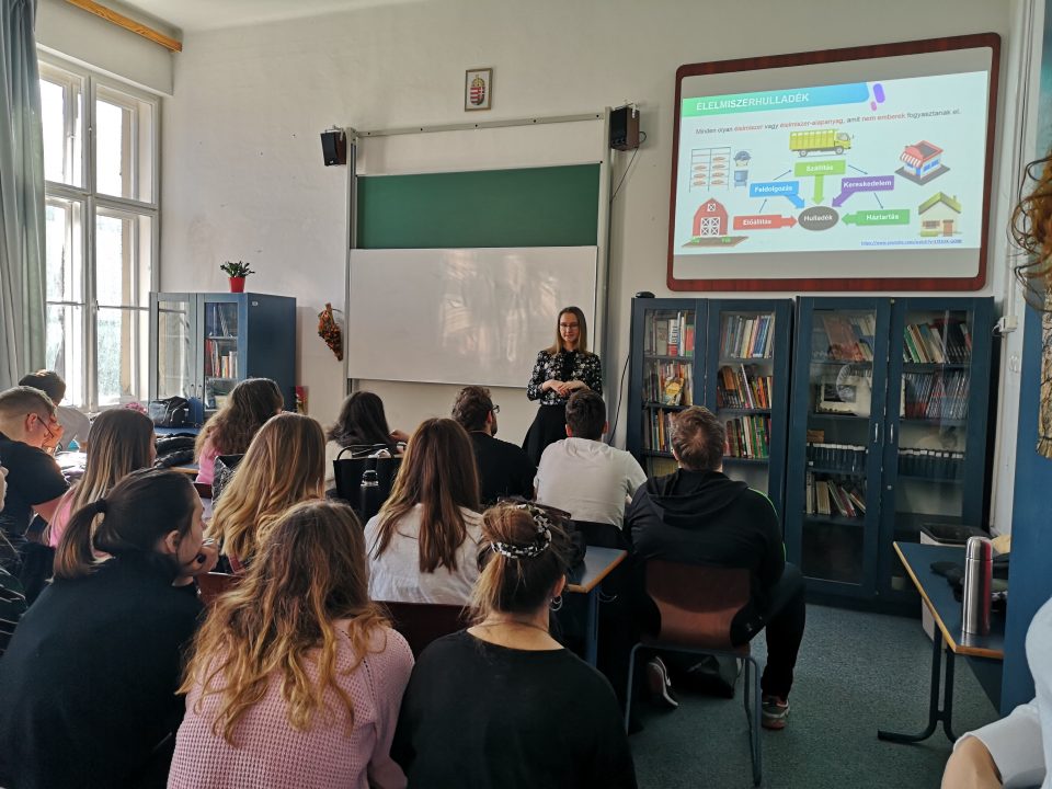 A budapesti Hunfalvy János Két Tanítási Nyelvű Közgazdasági és Kereskedelmi Szakgimnáziumban tartottunk Maradék nélkül előadást – rendhagyó módon – 9. és 11. évfolyamos tanulóknak, akik a projektnapok keretében több megközelítésből is megismerkedhettek az élelmiszerpazarlás problémakörével, hiszen előző nap a Magyar Élelmiszerbank Egyesülethez is ellátogattak, ahol az élelmiszerek adományozásával kerülhettek közelebbi kapcsolatba.